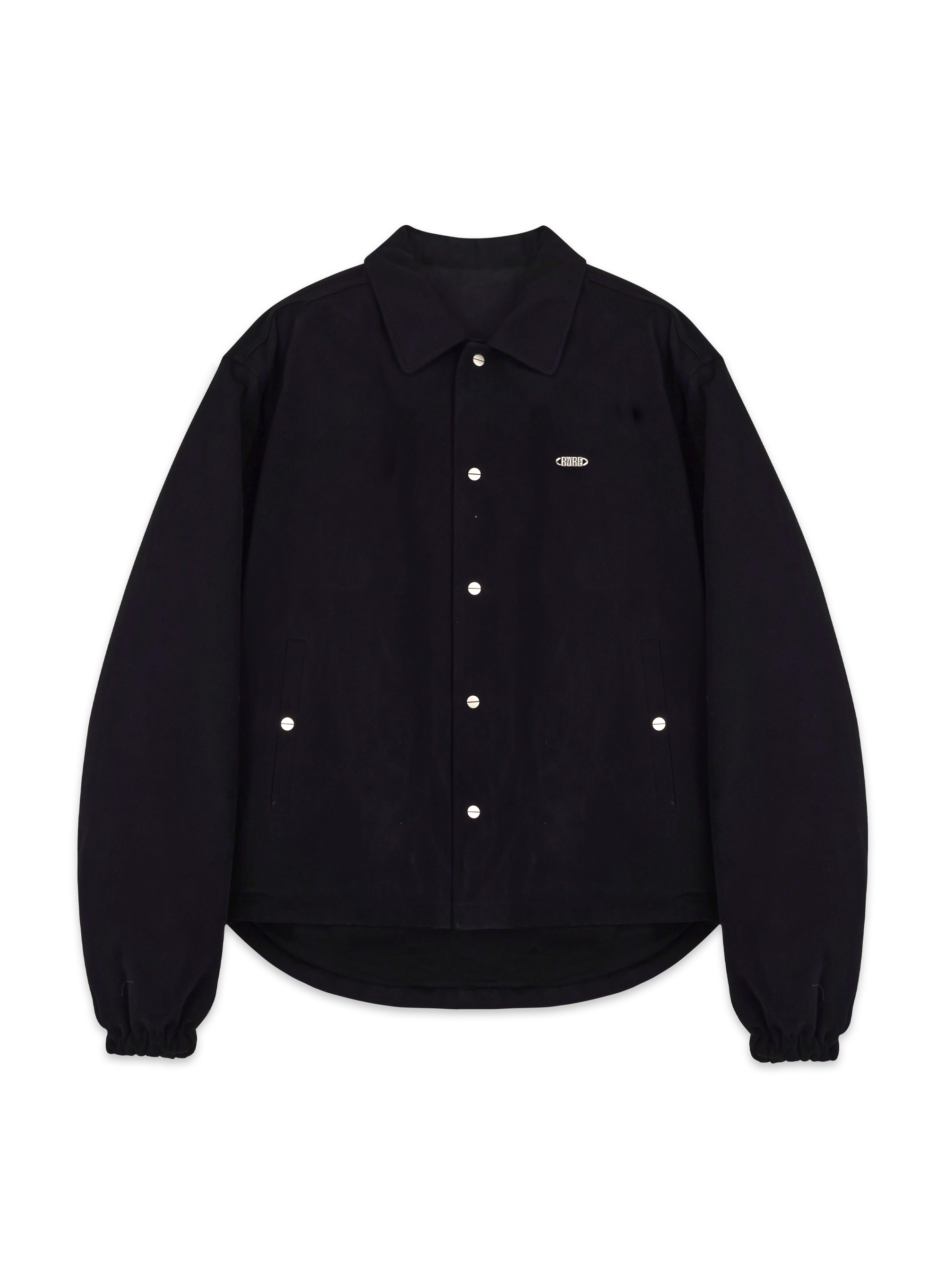 레더 아치 로고 패치와 로고 아플리케 장식의 오버사이즈 블랙 리버시블 롱 슬리브 파카